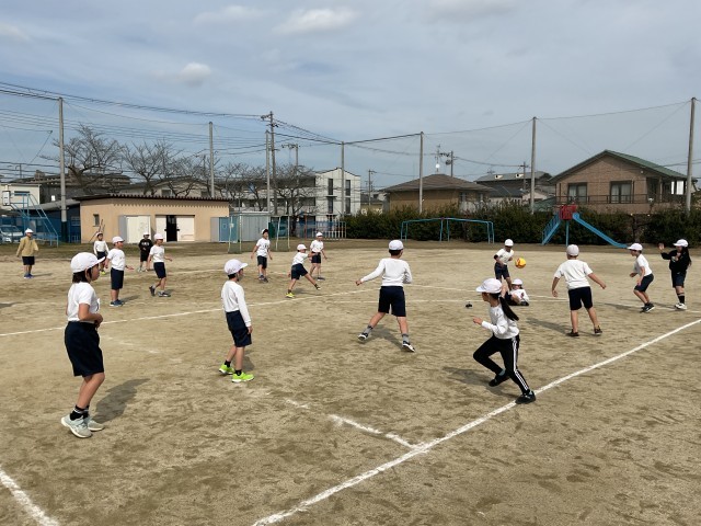 今日の5時間目、3年生が合同で体育をしていました。今日は、二手に分かれてドッジボールをしていました。今朝はあんなに寒かったお天気も、お昼ごろにはどんどん気温も上がってきて、3年生のほとんどの子どもたちが半袖で動き回っていました。