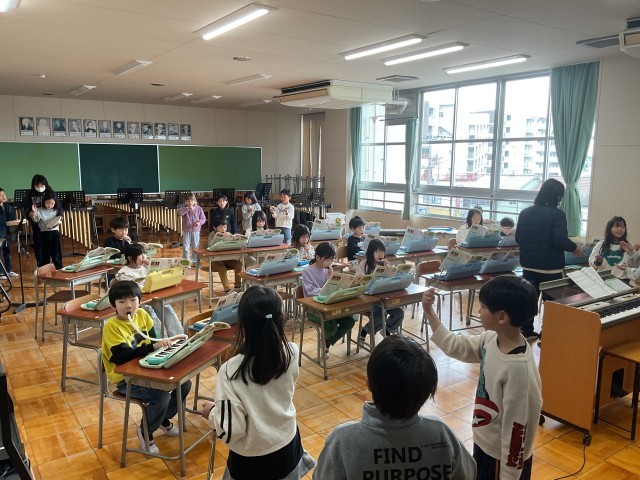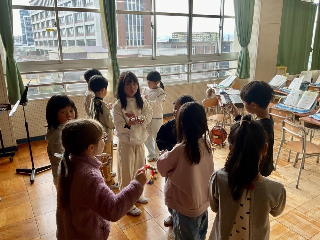 何度か練習したあと、鍵盤ハーモニカも加わって、合奏をしました。鍵盤ハーモニカの音を聞きながら、一生懸命リズムを合わせていました。いろいろな音が合わさって、楽しいマーチができあがりました。子どもたちも、ずっとにこにこしながら演奏していてとても楽しそうでした。