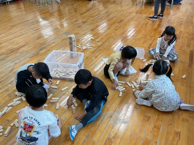 また、カプラを高く積み上げたりドミノのように並べたり、創作意欲の高さにも驚きます。トランポリンも人気で、昨日はうまく順番通りに飛べなかった場面もあったのに、今日はゆずりあって、みんなが仲良く楽しんでいたことにも感心しました。最後の片付けも、友だちと協力しながらとっても素早い!かっこいい姿がたくさん見られましたよ。