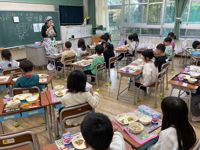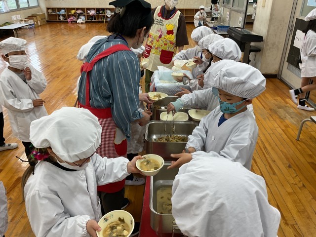 今日から2〜6年生の給食が始まりました。新しいクラス、新しい教室での給食当番は、今までとまた少しちがうようで、配膳室の前での「○年○組、○番です。」の言葉も、まだ慣れていないので、なんだか照れくさそうです。それでも「いただきます!」のあいさつは、どのクラスもしっかりとできていました。