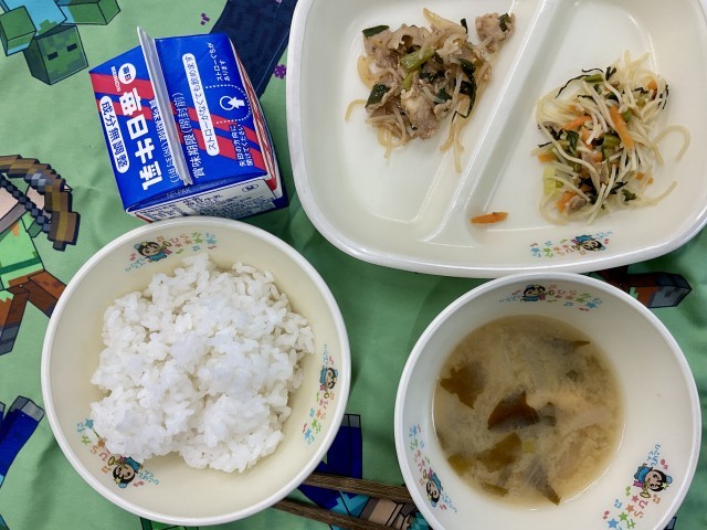 今日の給食は「ご飯・みそしる・豚スタミナ丼・ビーフンの炒めもの・牛乳」でした。子どもたちは、久しぶりの給食に「校長先生!めっちゃおいしい♪」とうれしそうに伝えてくれました。これからも、たくさん食べて、おいしさの感想をどんどん教えてくださいね。今年度も安全・安心でおいしい給食を届けたいと思います。