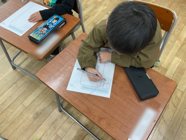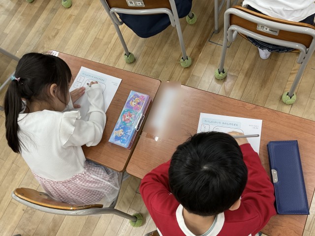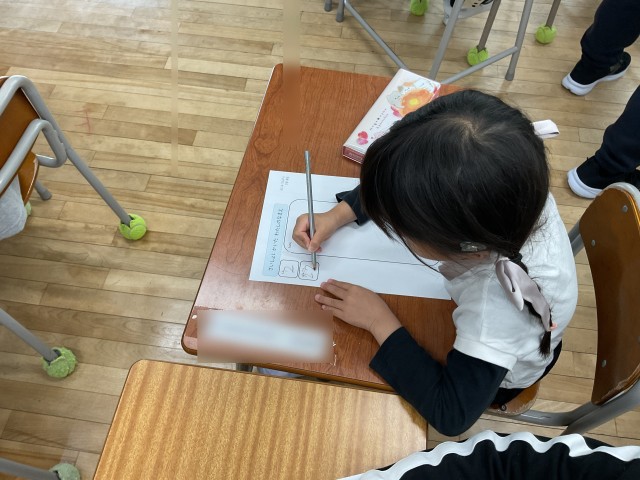 書き終わると「見て!」とたくさんの子どもたちに呼ばれ、がんばった力作を見て回りました。かきかたえんぴつの持ち方も、正しくならって、今はとても書きにくそうですが、練習をつんで慣れていってくれたらなと思います。「はじめてのなまえ」、できあがりをお家の人に見てもらうのが楽しみです♪
