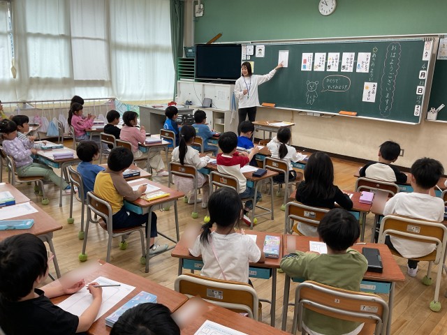 1年生の教室に入ると、子どもたちが、とてもうれしそうにかきかたえんぴつを持っていました。今日はみんなで、1人ずつのカードに自分の名前を書くことに取り組んでいました。机の左側に貼ってある、出席番号と名前を見ながら、一文字一文字丁寧に自分の名前を書いていました。