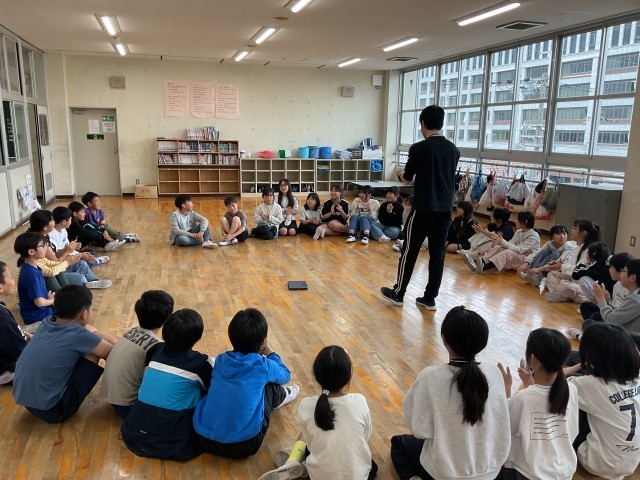 下の階まで響く、大盛り上がりの声に引き寄せられて、3階の5年生の様子を見に行きました。すると、オープンにみんなで輪になって、レクレーションを行っているところでした。中に入ると、リズムに合わせていろいろなテーマの言葉をつないでいます。