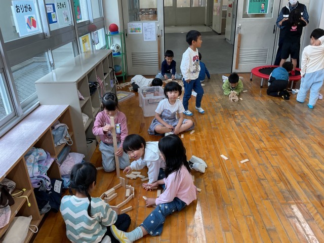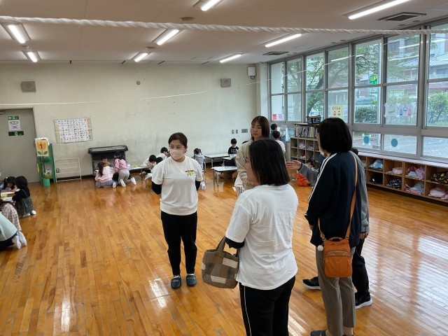 思いがけず、保育園の先生がやってきて、子どもたちも大喜び。自分たちが取り組んでいるきらりたいむの様子を得意げに説明していました。先生方も途中質問してくださるなどしながら、とても熱心に見学されていました。