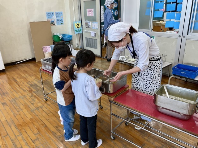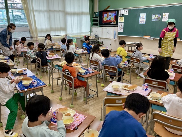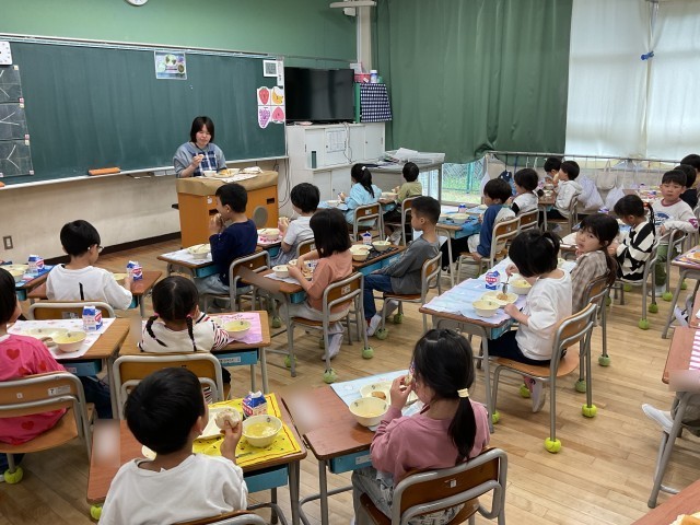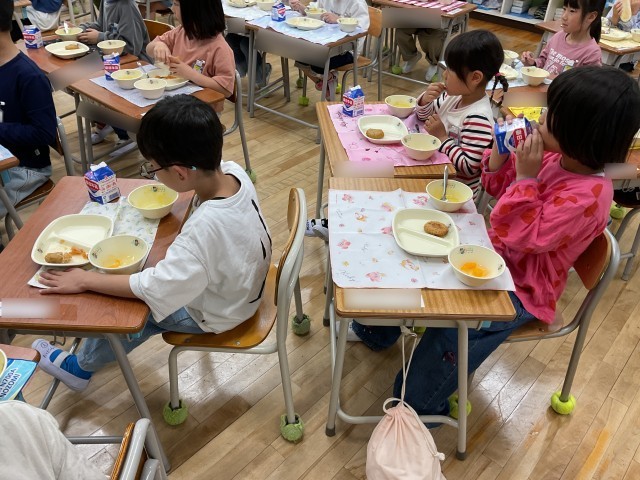 残念ながら、給食準備の写真が撮れなかったのですが、教室に入ると「校長先生!給食全部めっちゃおいしい!」と、笑顔いっぱいで教えてくれました。初日からおかわりに行く子も何人もいて、給食を楽しんでいる様子もたくさん伝わりました。