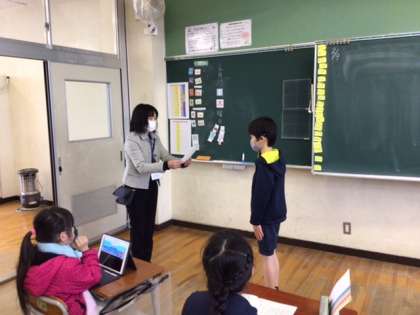 3年生も「読書ノート」の達成者(100冊以上本を読んだ人)がいましたので、教室で表彰を行いました。表彰状を渡すと、友達からたくさんの拍手をもらっていました。