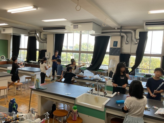 空気の実験をしています。筒に閉じ込められた空気を圧縮したらどうなるのか実験をしています。ピストンを押すことはできますが、一定以上は押せません。なぜだろう、空気はどうなっているのだろうと、たくさんの実験から謎をといています。「わかった」「こう違うかな」と言いながら自分の考えをまとめていました。