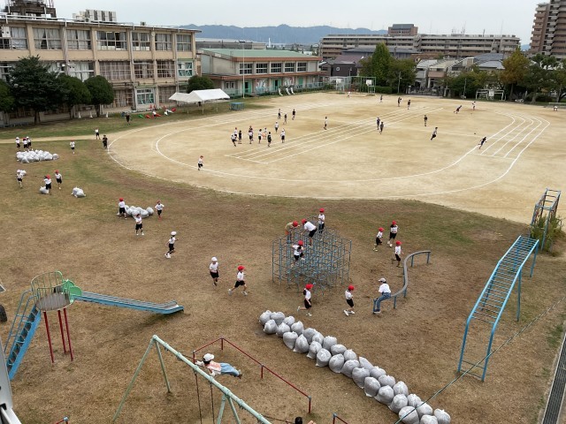 運動場では、児童や担任がドッジボール、キャッチボールをしていました。