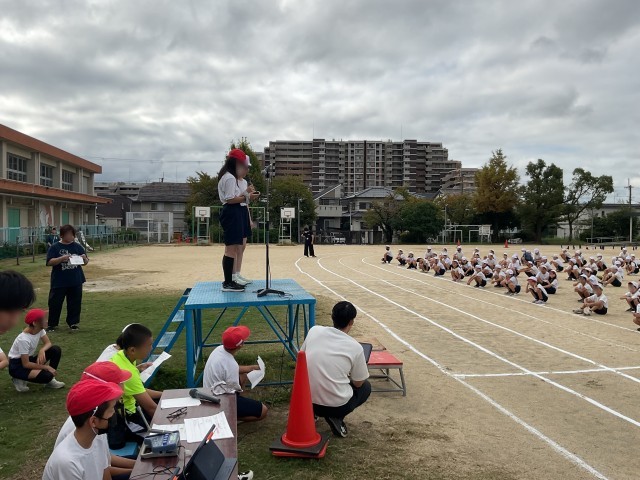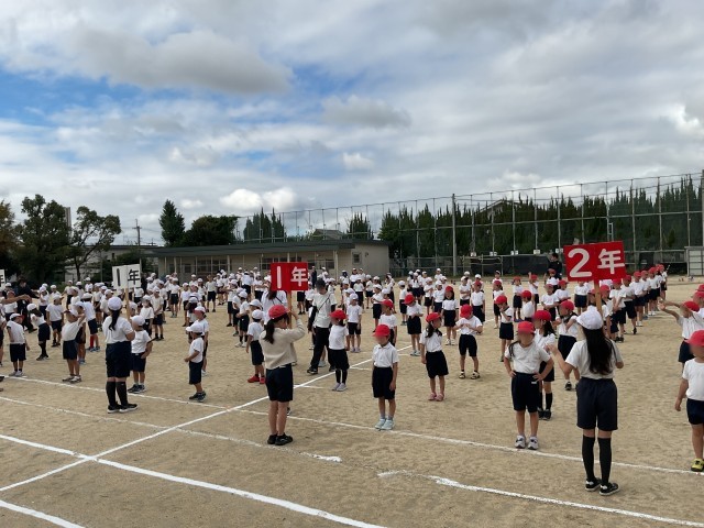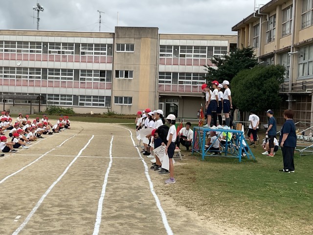 運動会本番に向け、全体練習を行いました。開会式・閉会式の練習です。司会係、プラカード係、放送係、得点係など、係活動の子どもたちと教職員が一緒になって確認を行いました。初めての開会式・閉会式の練習でしたが、子どもたちはしっかりとしていて、課題点も把握できていました。全体練習終了後は、課題点の解消に向けて先生と確認ができていましたので、本番が楽しみです。