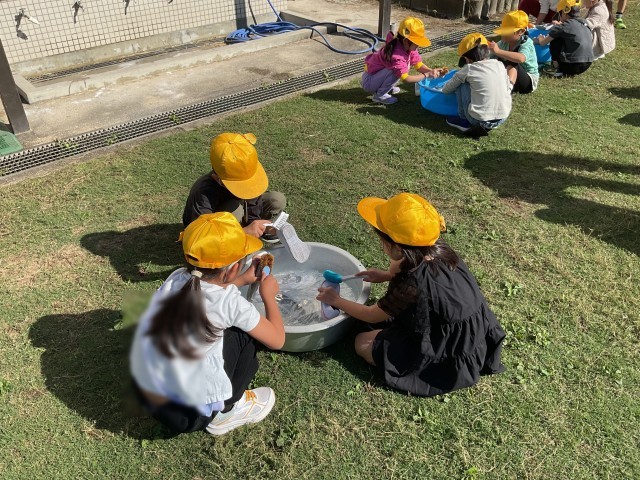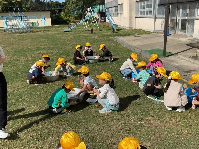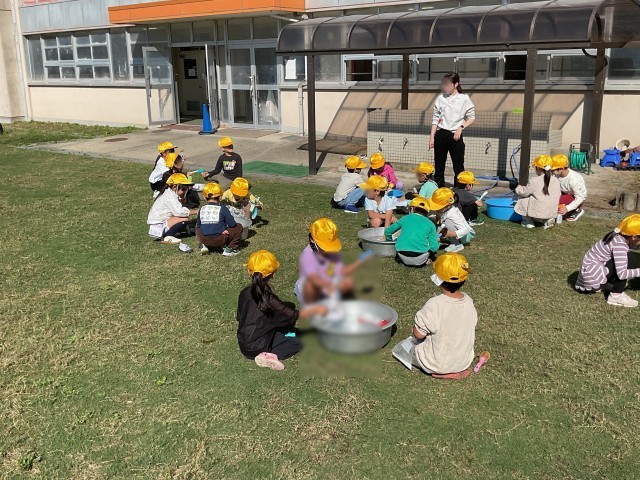 自分の履いている上靴を洗う体験をしています。靴の外も中もゴシゴシたわしで洗っています。洗剤の量も考えないと泡ばかりできれいにはなりません。最後は水ですすいで日当たりの良いところに干しておしまいです。