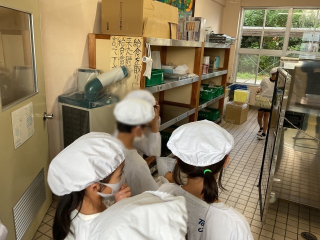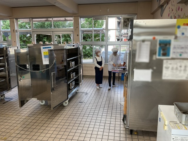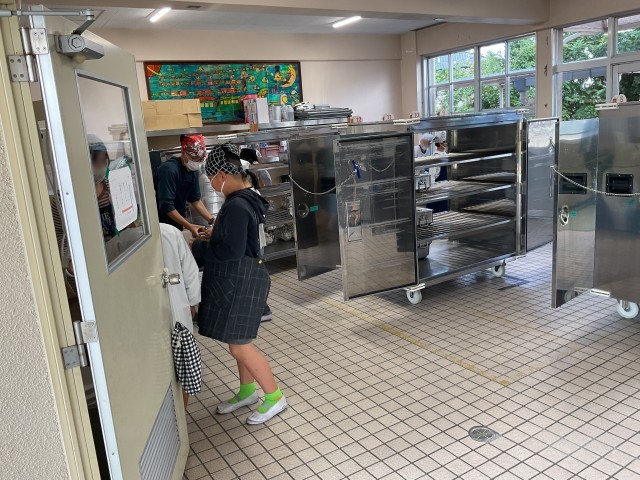 おいしい給食を配膳室にとりに行きます。配膳室では、配膳員さん、先生、給食委員会の児童がとりにきた各クラスの給食当番に食缶などを渡しています。限られたスペースの配膳室なので食缶が棚に積まれています。安全に給食当番が運べるように棚から下ろして手渡しています。