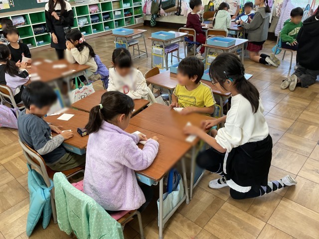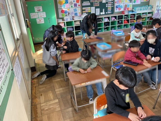 低学年のクラスを見ていると、「そうそう」「じょうず」「できてるよ」などプラスの声掛けをしている子がたくさんいました。折り紙が苦手な子も笑顔で取り組んでいます。