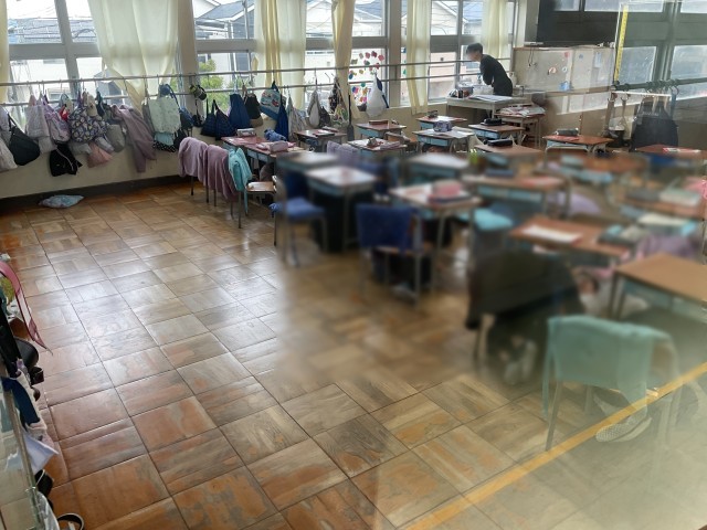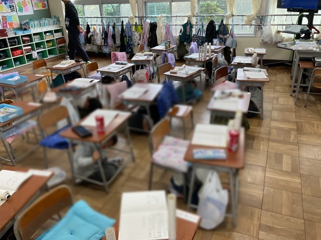 本日、大阪880万人訓練が実施されました。地震を知らせる放送があると、子どもたちはすぐに机の下に身を隠していました。