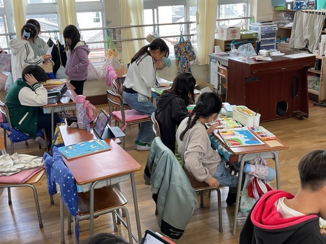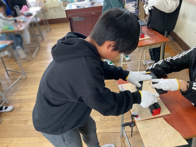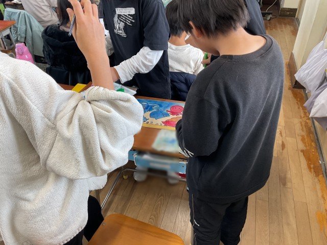 電動糸のこを使ってパズルを作っています。曲線を切るのが難しそうですが、ゆっくりと切っています。どんな絵を描くのか迷っている子は友だちと相談していました。ひとりでじっくりと考える子もおり、制作中にも個性が出ていました。