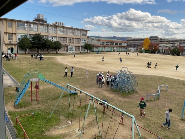 この時点で、学校にいるのは半分の児童。運動場はいつもより空いていました。