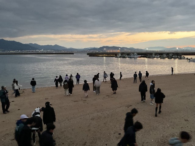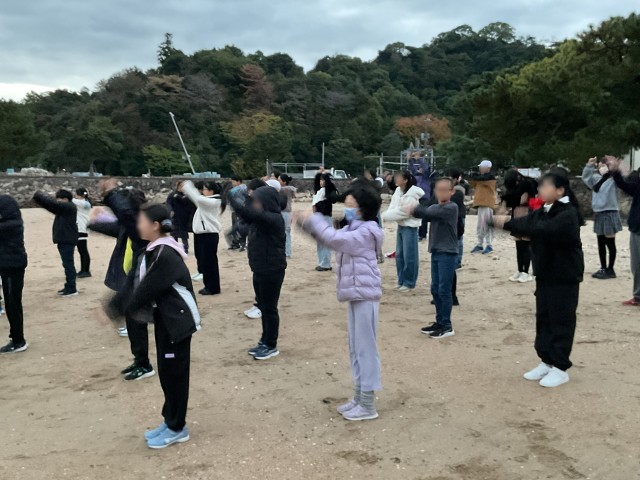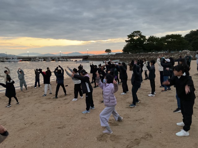 朝日を浴びながらラジオ体操をしています。海の香りでの目覚めです。