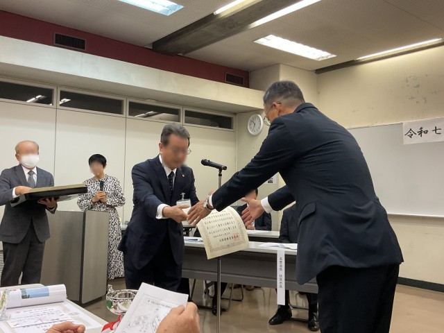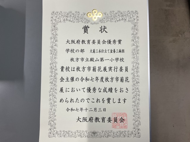 枚方市菊花展表彰式に参加しました。本校の大菊が大阪府教育委員会優秀賞に選ばれ、地域の殿一クラブの大菊が奨励賞に選ばれました。菊の街、枚方市の菊花展にて賞をいただき、大変うれしく思います。菊づくりにご尽力いただいた皆さま、本当にありがとうございました。
