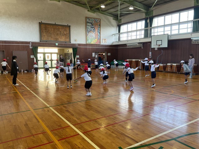 1組は、体育館で縄跳びの練習をしました。