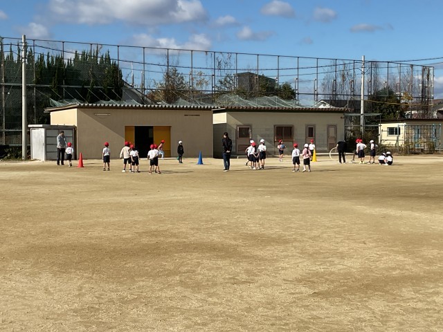 2組は、運動場でボール投げの練習をしました。