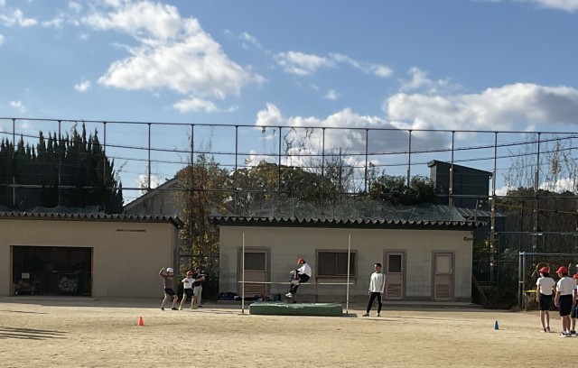 1組は、運動場で高跳びをしました。