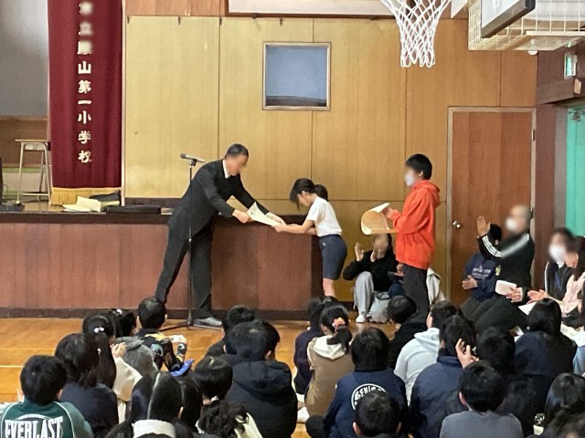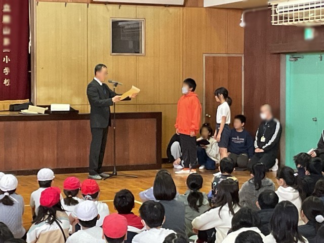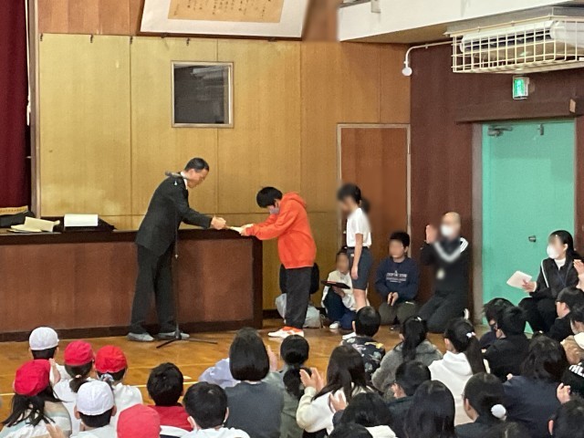 児童集会で、大阪府および大阪府教育委員会主催のプログラミングコンテストで優秀賞になった2名の児童を表彰しました。優秀賞になった二人は現在、次の3次審査に進んでいるようです。これからもがんばってほしいものです。