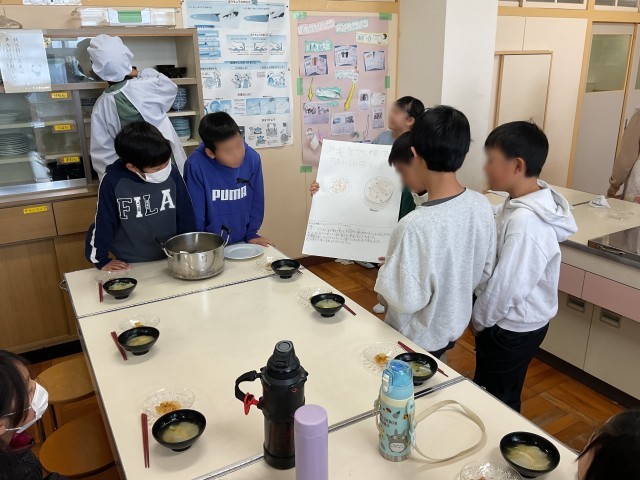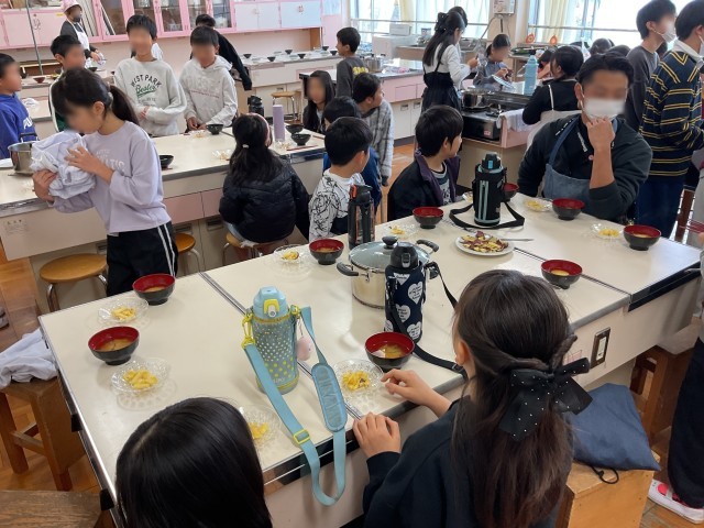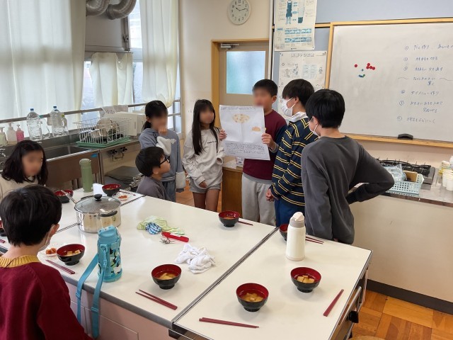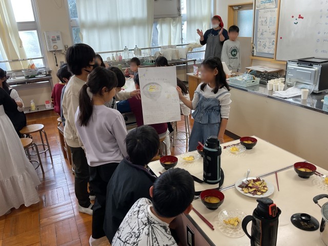3年生を招待し、発表することと、調理実習で作ったご飯とみそ汁を振る舞いながら交流する時間でした。