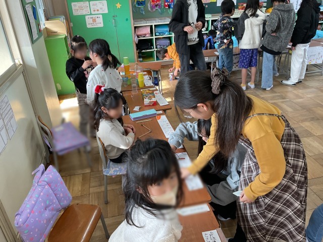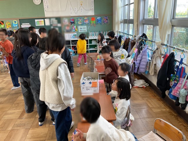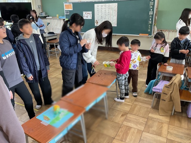 1年生から招待を受けて、1年生の作ったおもちゃで6年生が遊んでいます。6年生は、遊び方をやさしく聞き一緒に遊んでいます。1年生はすごく喜んで大満足です。1年生は6年生に喜んでもらおうとがんばり、6年生は1年生の思いを理解して楽しんでいました。やさしいポカポカした時間がすぎていました。