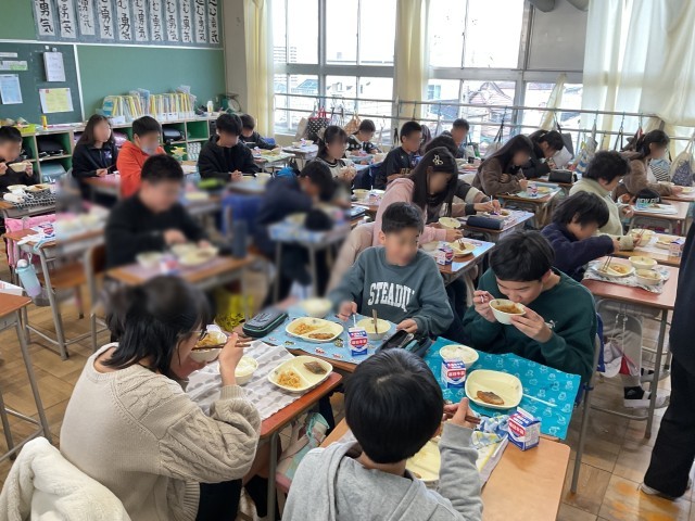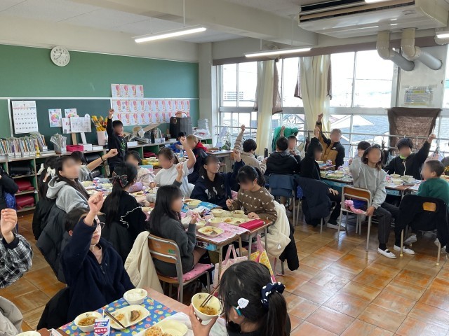 おかわりしたいと多くの子が手を挙げています。今日はとっても寒いので、あったかい玉ねぎのおつゆが人気です。