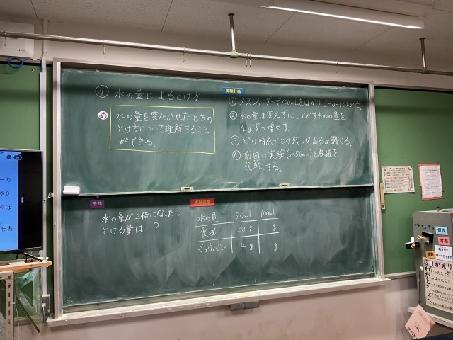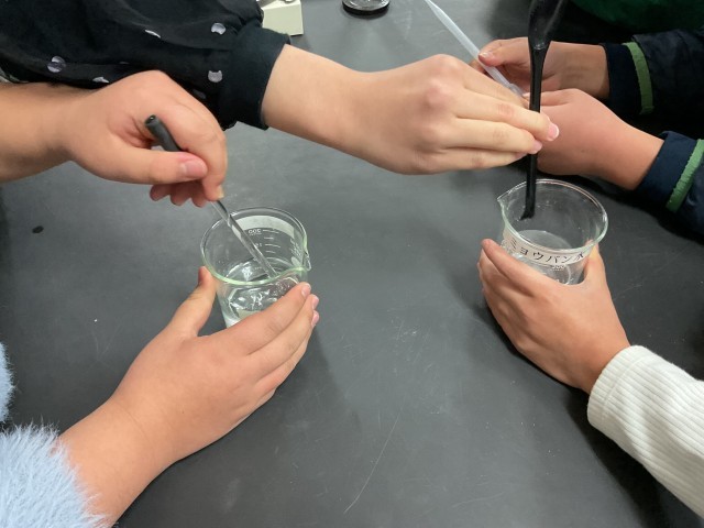 児童は班に分かれ、水の中での物質の溶け方について学びました。