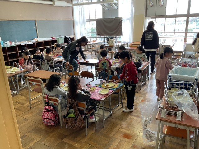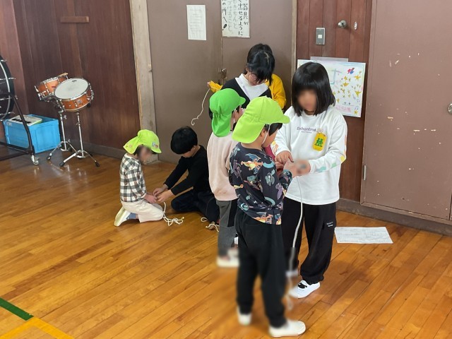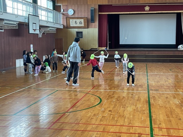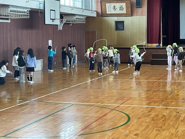 高陵幼稚園、たんぽぽ保育園の子どもたちが小学校に来てくれました。教室でのお勉強体験、体育館で1年生との遊び体験をしてくれました。体育館では、1年生からのあいさつの後、こま回しやなわとび、お手玉などをして一緒に遊びました。
