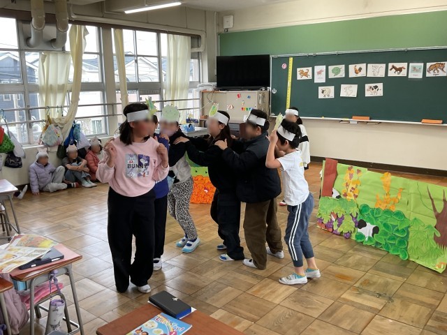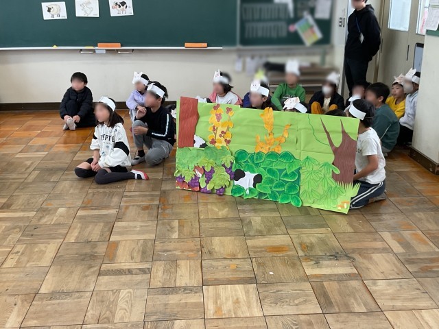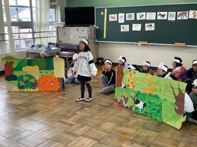 英語で劇を行っていました。練習を行い、改善した方が良い点をみんなで出し合い、本番にのぞんでいました。ジェスチャーの大きさや声の大きさ、ゆっくりとセリフを言うことなど出てきた意見を意識しながら本番を行っていました。