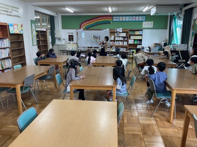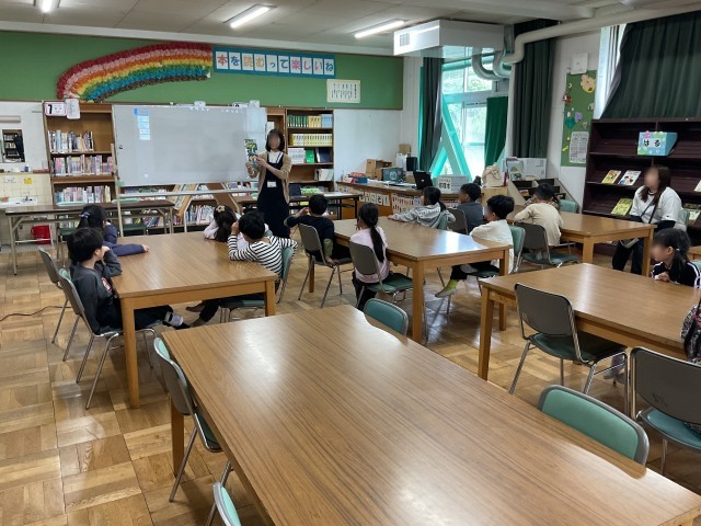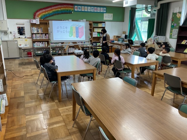 1年生が学校図書館について説明を受けています。まずは、本を読んだらどんな楽しいことがあるのか、絵本を使って紹介を受けていました。その後、スライドで学校図書館の使い方について説明を受けています。