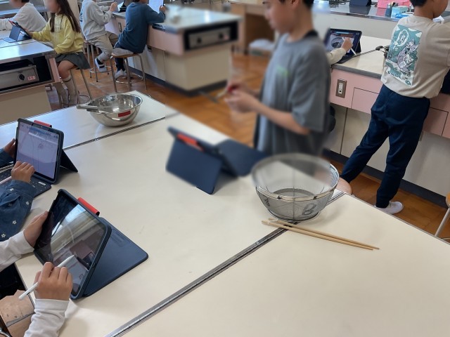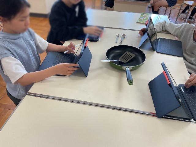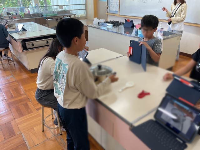 調理実習に向けて用具の確認をしています。次に行う調理実習は、キャンプの時に行うカレー作りにもつながっています。