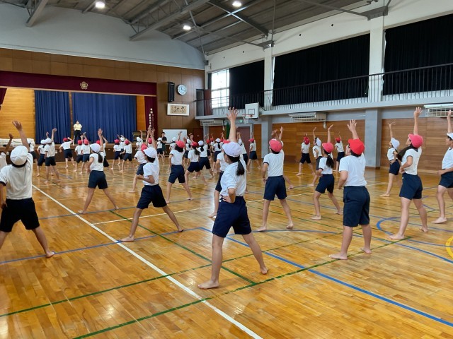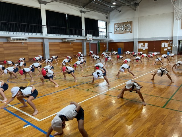 体育館では、5年生がソーラン節の練習に励んでいました。腰を低く落としたり指先まで神経を集中させたり、子どもたち1人1人が意識して取り組んでいることが伝わってきました。見学していた子どもたちもしっかりと声を出して参加している姿に5年生の一体感を感じました。