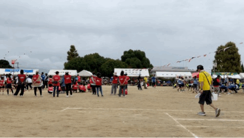 みんなで一斉に、籠に向けて玉を入れます。3チーム同時に玉を投げ入れました。
