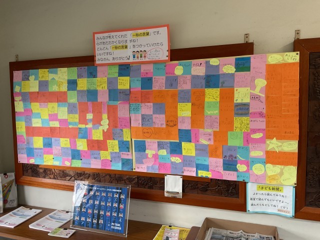 校長室前に子どもたちから集めた「1秒のことば」を掲示しています。「1秒のことば」とは、短いけれど、聞くと心があたたかくなることばです。その言葉を見て、子どもたちが元気になったり勇気をもらったりしてくれたらいいなと思っています。ちなみに、オレンジの文字だけを意識して見ると、ある文字が見えてきます。わかりますか?!