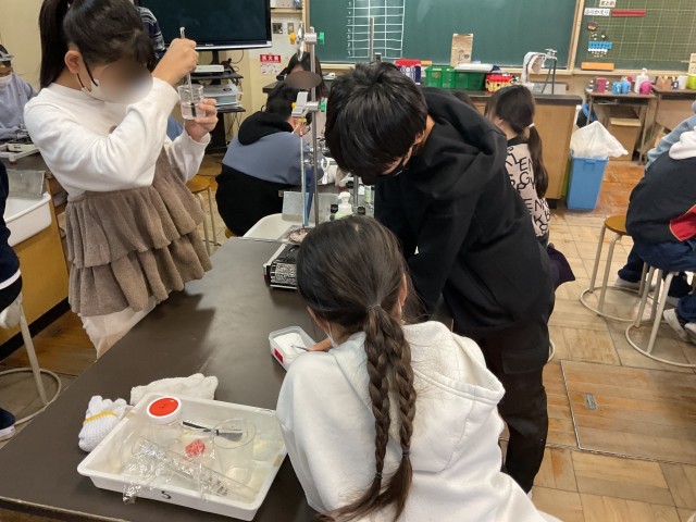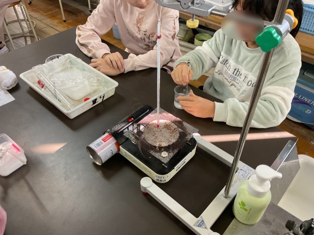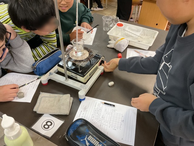 5年生は理科で「ものの溶け方」について学習しています。水の温度を変えていくと、食塩の溶ける量やミョウバンの溶ける量はどうなるのか実験をしました。自分たちで実験すると楽しいし、より記憶に残りやすいです。怪我のないように安全に気をつけて、色々な実験をしていきます。