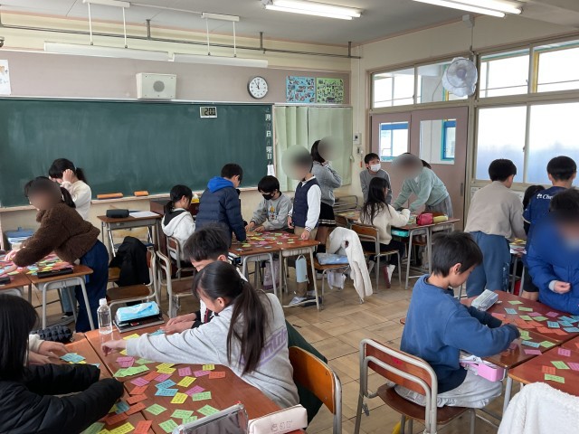 百人一首大会(4年生) 公開日 2026/02/09 更新日 2026/02/09 学校の様子 4年生の教室では、百人一首大会が行われていました。ちょうど、机の上に札を並べていたのですが、その数なんと100枚!普段は、札を覚えるために枚数を区切って行われているのですが、今日は全ての札での対戦でした。見つけるのもたいへんだなと思っていましたが、そんな心配は必要ありませんでした。数秒で決着がつき、子供達の力に感心しっぱなしでした。 いいね(2)
