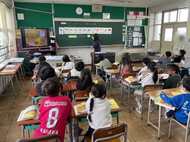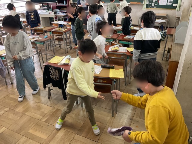 3年生の教室に行ってみると、外国語の授業でした。先生のデモンストレーションを見ながら、今回のテーマである「Who am I ?」の使い方を学んでいました。その後は、ゲームを通して「Who am I ?」の理解を深めていました。実際に使うことで定着していきます。どんどん使っていってほしいですね。