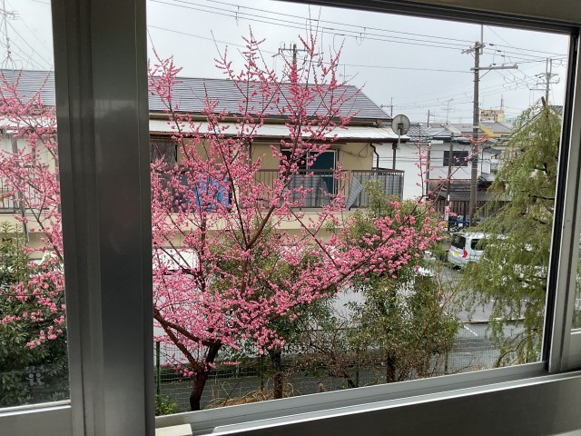 写真は、ある教室からの景色です。雨は降っていますが、外を見ると季節を感じることができるのも素敵ですね。