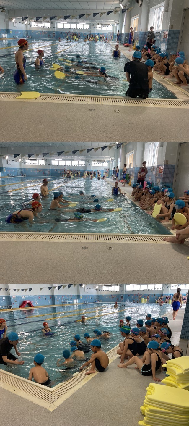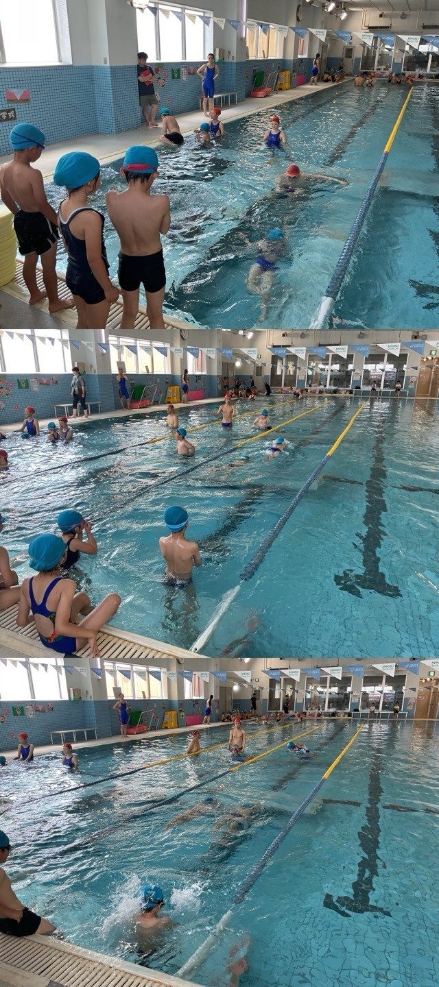 午前中の12時間目は、3年生、34時間目は、2年生が、それぞれの泳力のグループに分かれて、ふしうきやバタ足など、たくさんのことを教えてもらいました。
