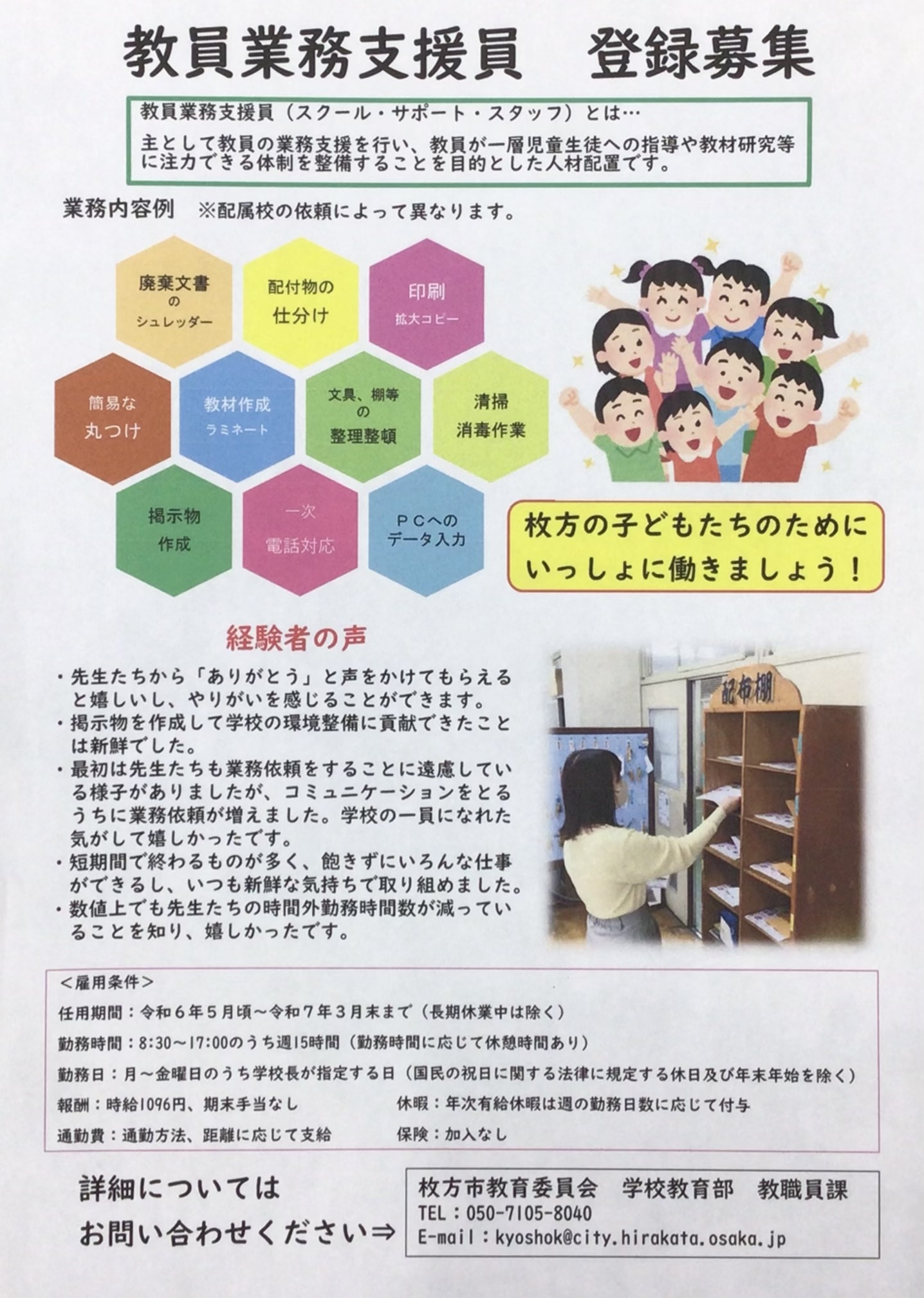 教員業務支援員とは、主に教員の業務支援を行い、教員が一層児童生徒への指導や教材研究等に注力できる体制を整備することを目的とした人材配置です。