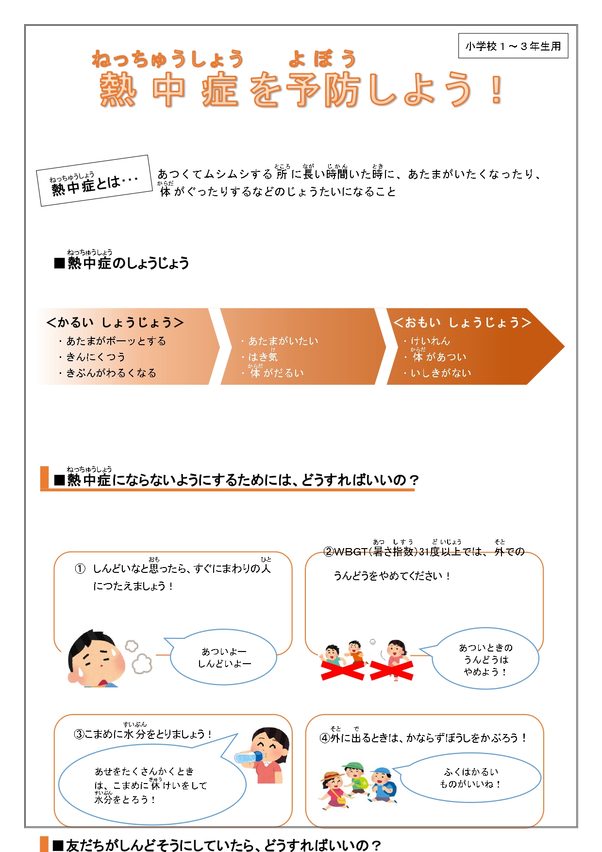 熱中症予防について 公開日 2024/07/05 更新日 2024/07/05 学校の様子 今日も暑い一日となりました。週末、来週も暑くなることが予想されます。子どもたちには、こまめに水分補給をしながら過ごしてもらえたらと思います。 また、(1)「熱中症対策について」(1〜3年生用)(2)「熱中症予防について」(4〜6年生用)(3)「熱中症予防について」(保護者用)を掲載しています。ご確認ください。 いいね(0)