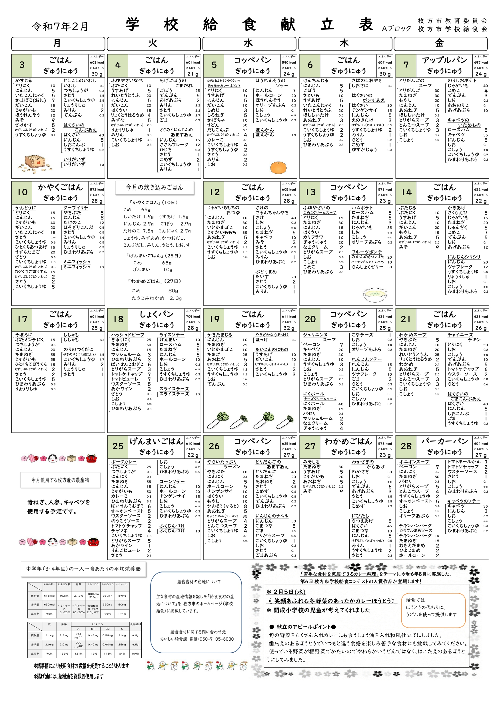 「2月給食献立表」のお知らせです。配布文書にも掲載います。ご確認ください。