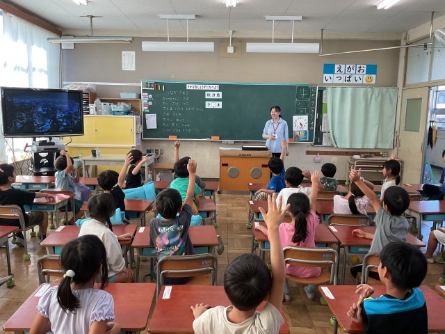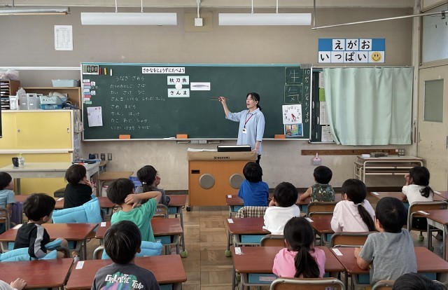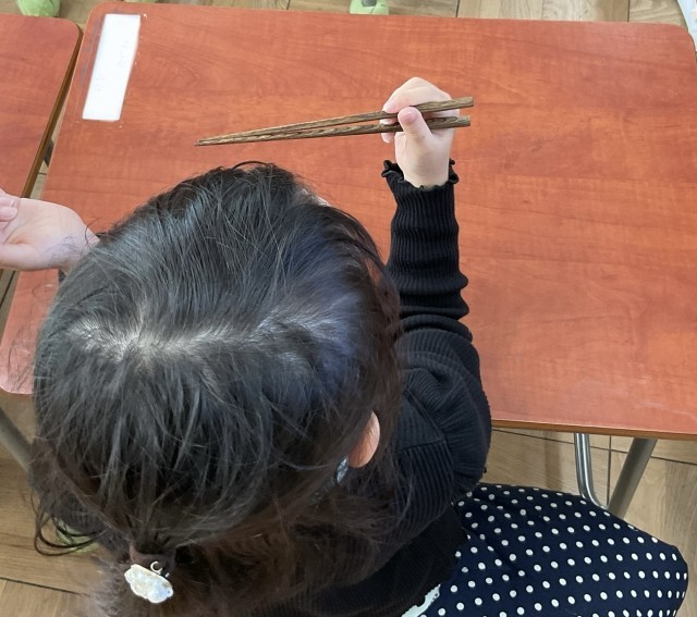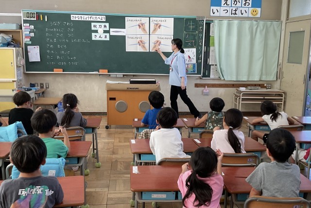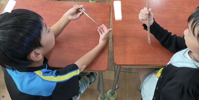 栄養教諭が、秋の魚、秋刀魚の話や、お箸の正しい持ち方など、