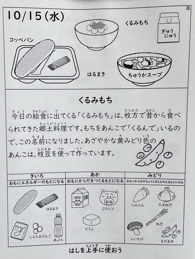 今日は枚方の郷土料理「くるみ餅」が出ました。
