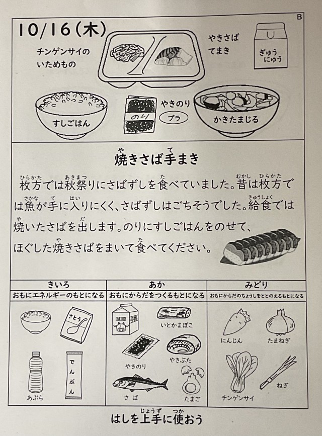 今日は焼きサバの手巻き寿司でした。枚方の秋祭りでの定番料理ですね。サバは脂がよくのっていて、とても美味しかったです。