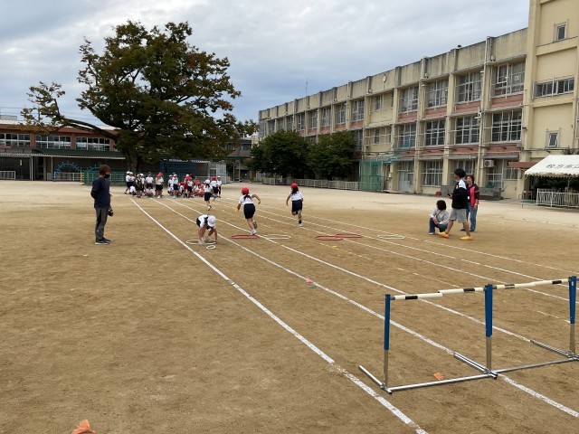 輪っかやハードルをくぐって、バトンパスをして、走りをつなぎます。