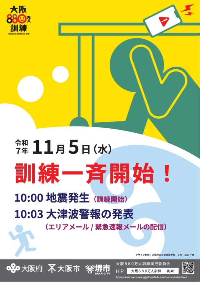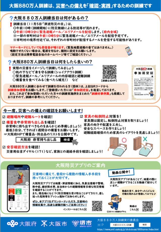 本日、11月5日は、『大阪880万人訓練』は、大地震・津波の発生を想定して、エリアメール/緊急速報メールの配信などにより、府内の皆さんに訓練として災害情報を伝達するものです